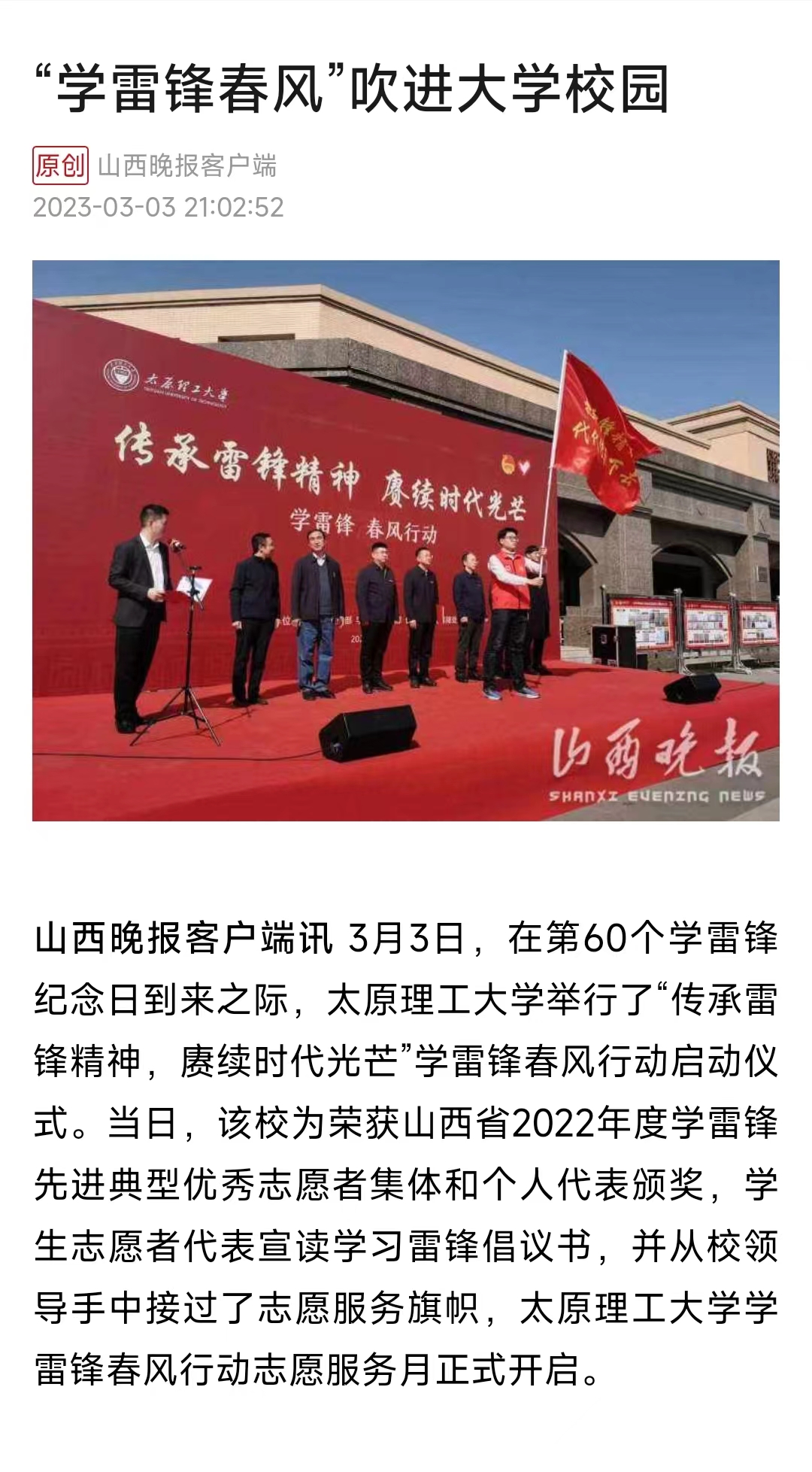 山西晚报客户端讯3月3日,在第60个学雷锋纪念日到来之际,356体育在线官网举行了“传承雷锋精神,赓续时代光芒”学雷锋春风行动启动仪式。当日,该校为荣获山西省2022年度学雷锋先进典型优秀志愿者集体和个人代表颁奖,学生志愿者代表宣读学习雷锋倡议书,并从校领导手中接过了志愿服务旗帜,356体育在线官网学雷锋春风行动志愿服务月正式开启。