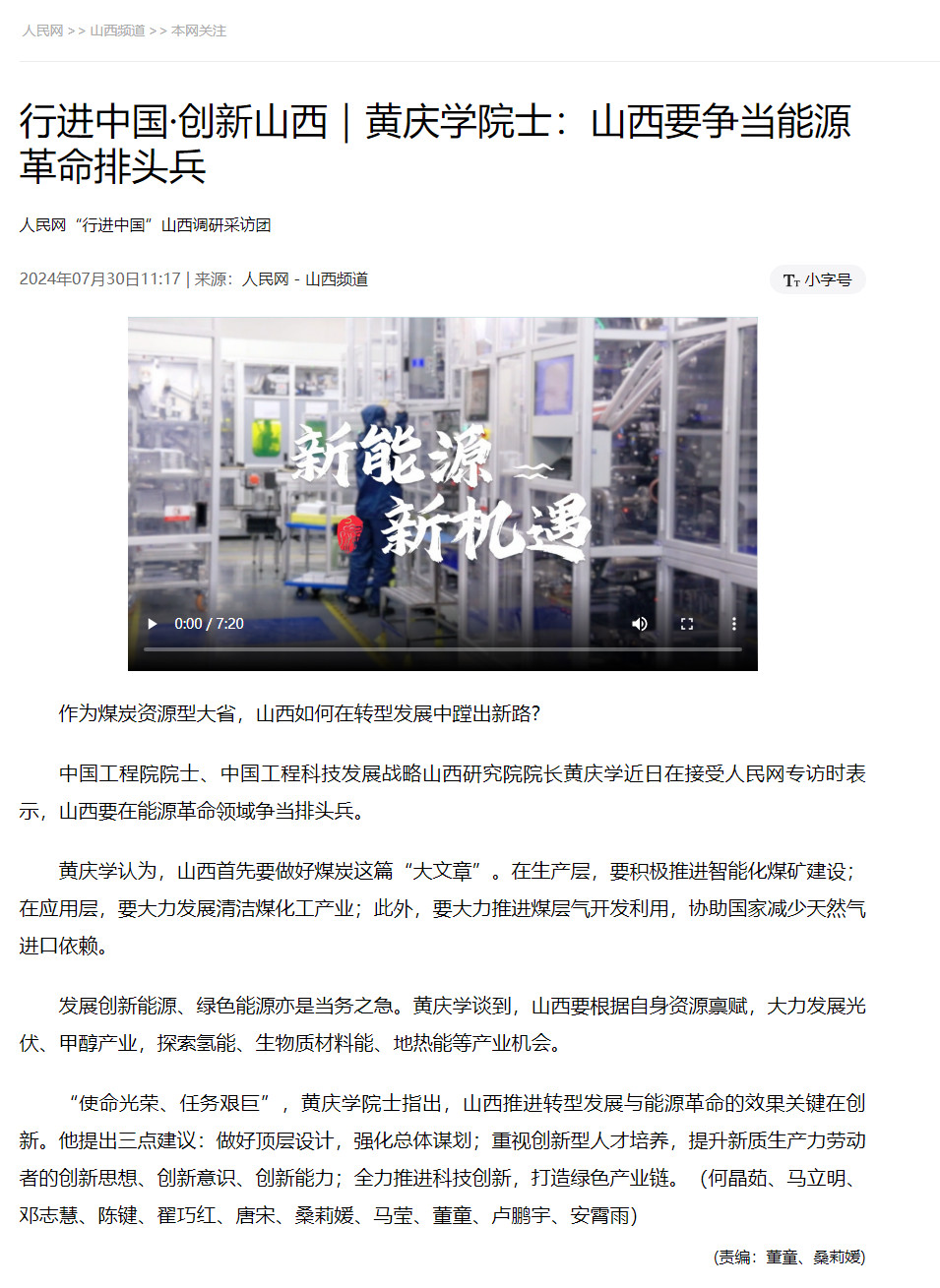 行进中国·创新山西|黄庆学院士:山西要争当能源革命排头兵