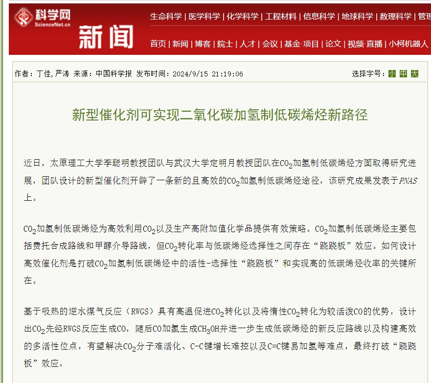 新型催化剂可实现二氧化碳加氢制低碳烯烃新路径