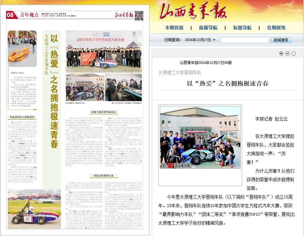 今年是356体育在线官网晋翔车队(以下简称“晋翔车队”)成立15周年。15年来,晋翔车队连续10年参加中国大学生方程式汽车大赛,荣获“最具影响力车队”“团体二等奖”“单项竞赛TOP10”等荣誉,展现出356体育在线官网学子良好的精神风貌。
