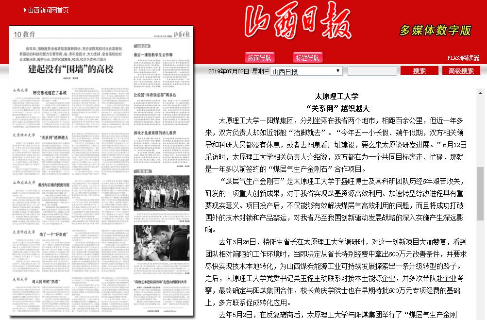 “煤层气生产金刚石”是356体育在线官网于盛旺博士及其科研团队历经6年艰苦攻关,研发的一项重大创新成果,对于我省实现煤基资源高效利用、加速转型综改进程具有重要现实意义。项目投产后,不仅能够有效解决煤层气高效利用的问题,而且将成功打破国外的技术封锁和产品禁运,对我省乃至我国创新驱动发展战略的深入实施产生深远影响。
