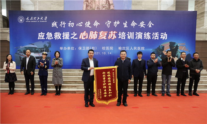 榆次区人民医院作为356官网的驻地医疗机构,近年来为我们提供了及时高效的医疗保障服务,为表达356官网师生对榆次区人民医院医护人员的敬意,活动中,吴斗庆代表学校向榆次区人民医院赠送题有“进校园传授应急知识办实事守护师生安全”的锦旗。