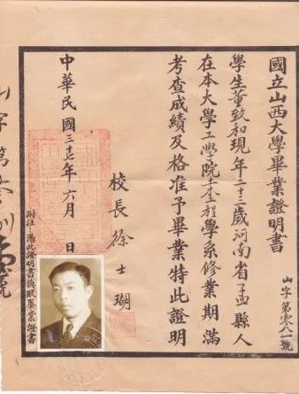 1948年国立山西大学工学院毕业生毕业证明书