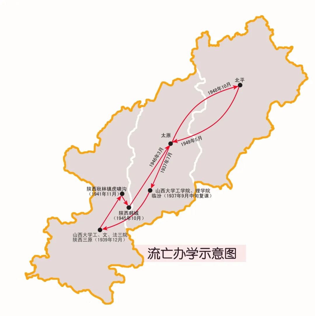 1937年 8月,日军飞机不断轰炸太原,阎锡山接受了我党抗日民族统一战线的主张“守土抗战”,山西大学工学院、理学院奉命迁往临汾;9月中旬开课时,因局势紧张,师生到校不足一半;11月8日,太原失守,山西省政府下令各大专院校立即停课解散。学校在战火中艰难生存,开始了辗转数地办学的岁月。