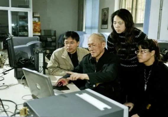 与吴文周教授、张善元教授、博士生韩强、梁非在实验室讨论问题