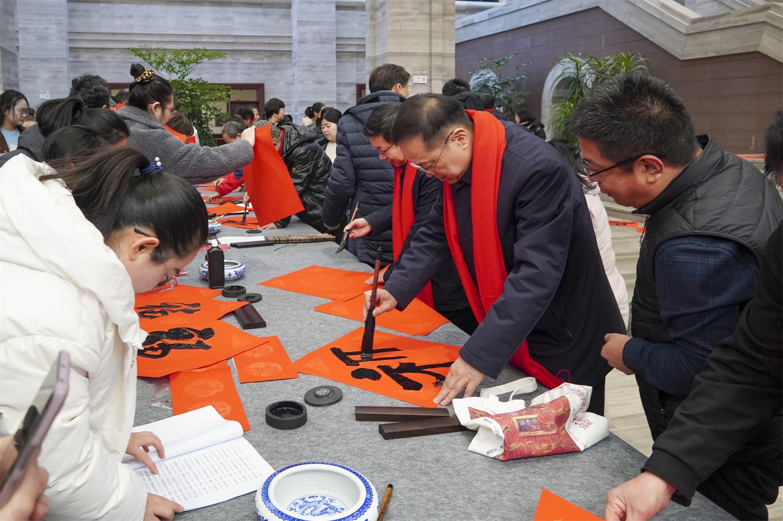 翰墨飘香,喜迎新春。新春佳节将至,为弘扬传统文化,营造浓厚的节日氛围,1月7日,省文联、省书协“万福迎春”公益活动走进356官网,山西省文联党组成员罗向东,中国书协理事、山西省书协主席石跃峰,山西省书协顾问、省书画家协会名誉主席 356官网教师徐树文等20余名省城知名书法家齐聚356官网明向校区行政楼大厅,为师生现场写春联、送祝福。356官网党委书记沈兴全会见了书法家一行,党委常委、副校长任喜莹出席活动并致辞。