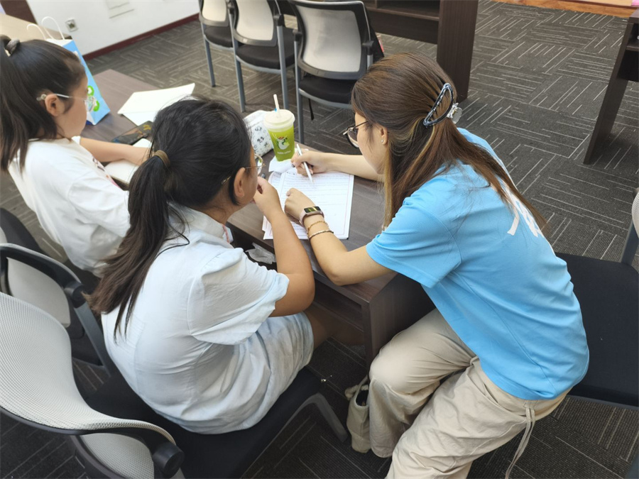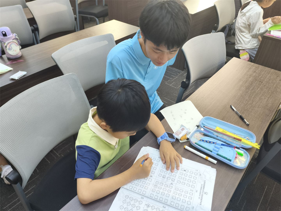 志愿者们化身贴心的“学业伙伴”,针对不同年级的孩子分组辅导暑期作业,分享实用的时间管理和高效笔记方法,还为高年级学员点拨学科规划与兴趣发展的方向,帮助孩子们在假期里也能扎实知识根基。运动场上同样活力四射,羽毛球拍挥洒如风,毽子上下翻飞灵动敏捷。志愿者们将科学热身、技巧讲解与趣味游戏巧妙结合,孩子们在奔跑跳跃、挥洒汗水中锻炼着反应能力,也体会着团队协作的乐趣,蓬勃的朝气洋溢在校园里。