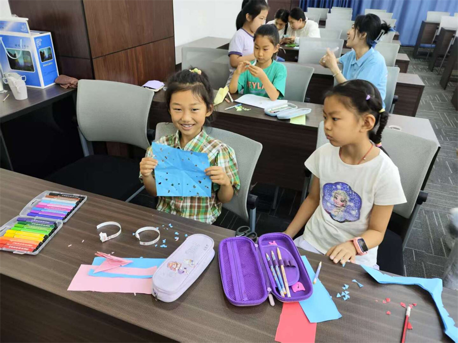 走进剪纸课堂,氛围静谧而专注。孩子们的小手翻飞,传统的折纸技法在指尖流转,寓意吉祥的对称纹样渐渐在纸上呈现,形态各异的凤尾花、窗花悄然绽放。这不仅仅是一次非遗技艺的亲手体验,更是让中华优秀传统文化的种子,在童心中悄然生根。