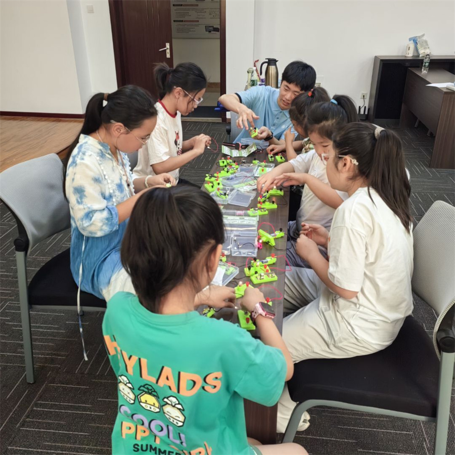在明向校区物理与光电工程学院南楼的304教室,孩子们屏息凝神。当导线轻轻触碰电池,串联电路接通的那一刻,灯泡骤然亮起!孩子们稚嫩脸庞上绽放的惊喜光芒,瞬间点亮了“量子童芽”暑期素质拓展训练营的探索之旅。