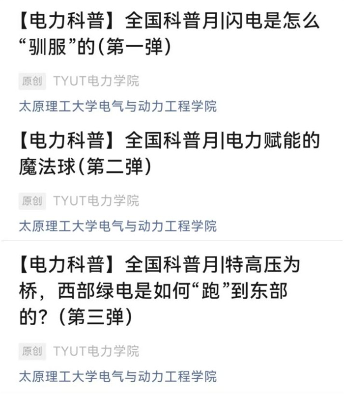 活动期间,在学院官方公众号上全新推出“电力科普”专栏,专栏以“贴近生活、立足专业、展现前沿”为定位,围绕电力领域核心科技展开内容创作。通过通俗易懂的语言和生动形象的案例与图片,将抽象的电力科技转化为可感知的知识。
