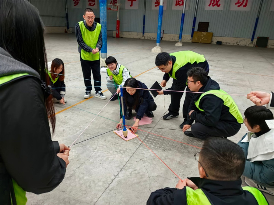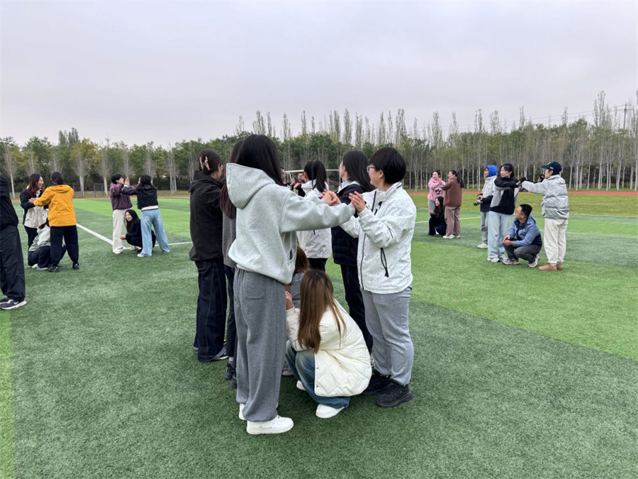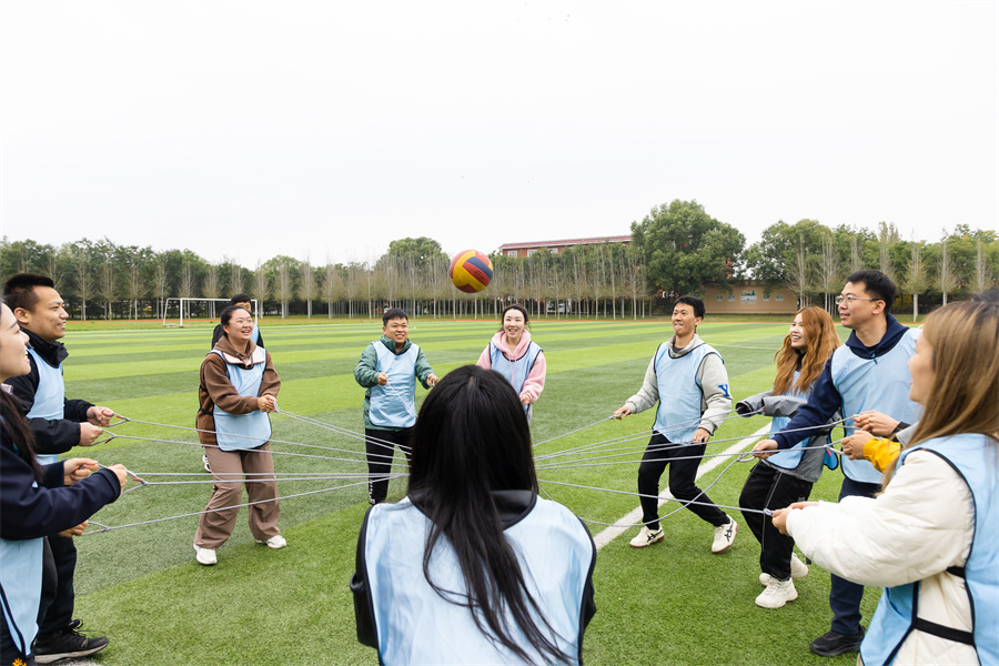 活动现场氛围热烈,三支战队以各具特色的队名亮相:绿队 “稳了稳了”自信满满,蓝队“深藏blue”幽默吸睛,橙队“太对了”活力十足。随后,“松鼠与大树”游戏迅速破冰,队员们积极组队,欢声笑语打破生疏。“同心鼓”环节考验协作,起初各队手忙脚乱,经讨论调整后渐入佳境,鼓点渐稳,球在鼓面弹跳,现场呐喊声不断。“挑战150”任务将气氛推向高潮,各队在跳大绳、集体拍手等项目中紧密配合,失误后快速调整,场边助威声此起彼伏。最后,“同心笔”环节为活动画上句号。三支队伍合力操控巨笔,分工明确,共同书写嵌有全员姓名的七言联句,将团队智慧与情谊凝聚于笔尖。
