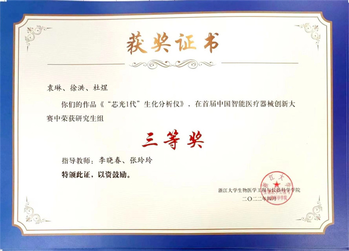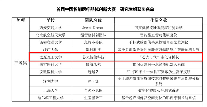 在首届中国智能医疗器械创新大赛中,356官网生物医学工程学院芯光智能团队的参赛作品《“芯光1代”生化分析仪》进入了决赛,最终荣获三等奖。该团队于6月3日收到大赛颁发的获奖证书。