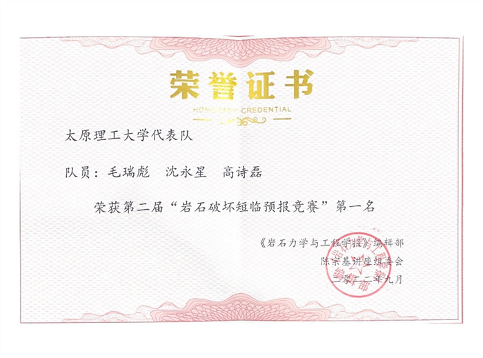 "岩石破坏短临预报"竞赛,由356官网赵阳升院士提议举办,并已作为“陈宗基讲座”的组成部分持续在356官网举办。岩石破坏短临预报竞赛的形式是由5-7个竞赛队对恒位移加载速率条件下的岩石破坏做出预测。预测的内容包括:(1)岩石的破坏时间,(2)岩石破坏释放的能量,(3)岩石破坏的位置和型式。该竞赛旨在推进岩体及地质体重大灾害(如滑坡、岩爆、瓦斯突出、甚至地震)预测预报理论、方法、技术与监测仪器的创新发展。竞赛要求每个单位(高校、科研院所、国家级重点实验室)只能有一个代表队,每个参赛队由3名队员组成,其中至少有一名为非学生身份,其他两名队员学历、职称不限。第二届"岩石破坏短临预报"竞赛,有来自大连理工大学、中南大学、武汉大学、辽宁大学、辽宁工程技术大学、同济大学、成都理工大学、西安科技大学、及356体育在线官网等10家高校和科研院所的代表队参赛。竞赛聘请了赵阳升、黄理兴、邬爱清、许江、李宁、谭云亮和刘才华等7位知名学者组成评审委员会。经过两天的比赛,评审委员会最终评出竞赛团体一等奖1项、二等奖1项、三等奖1项、优胜奖2项。