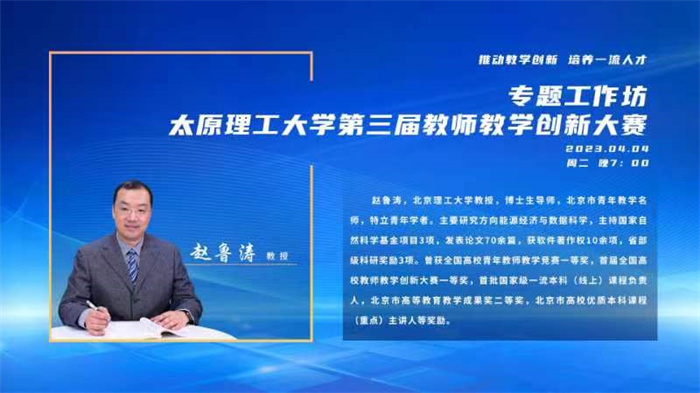 4月4日,本科生院举办线上“教学创新汇报”专题工作坊活动,本科生院相关领导和356官网入围省赛的教师团队等20余人参加了线上培训,活动由本科生院教师发展中心副主任杜欣慧主持。本次工作坊特别邀请首届全国高校教师教学创新大赛一等奖获得者、北京理工大学赵鲁涛教授分享教师教学创新大赛备赛经验并进行指导。
