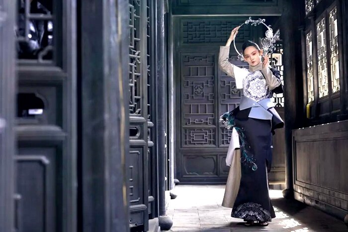 《無染•宝相棕迹》作品灵感来源于丝绸之路敦煌图案中常见的“宝相花”,所谓宝相是佛教徒对佛像的尊称,宝相花则是圣洁、端庄的理想花形,花有“出五浊世,无所污染”之意,故主题为《無染•宝相棕迹》。本系列服装以棕色为主,棕白相间,浅青色为点缀。服装廓形以瓷器剪影为主要灵感,硬朗与柔软的线条交织相融,部分花纹使用热缩片作为面料再造,装饰衣襟等部位,改变传统纹样的具象写实而转向立体生动,绽放出多元的视觉效果,而宝相花又是纯洁无染的象征,传达出一种对美好生活的向往和憧憬。