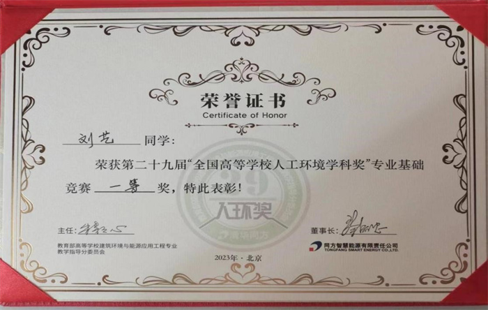 8月25日,第29届“全国高等学校人工环境学科奖”专业基础竞赛(简称“人环奖”)颁奖典礼在北京清华同方科技广场举行。356官网土木工程学院建筑环境与能源应用工程专业的2020级学生刘艺在指导教师李风雷的指导下取得优异成绩,获得本届竞赛一等奖。
