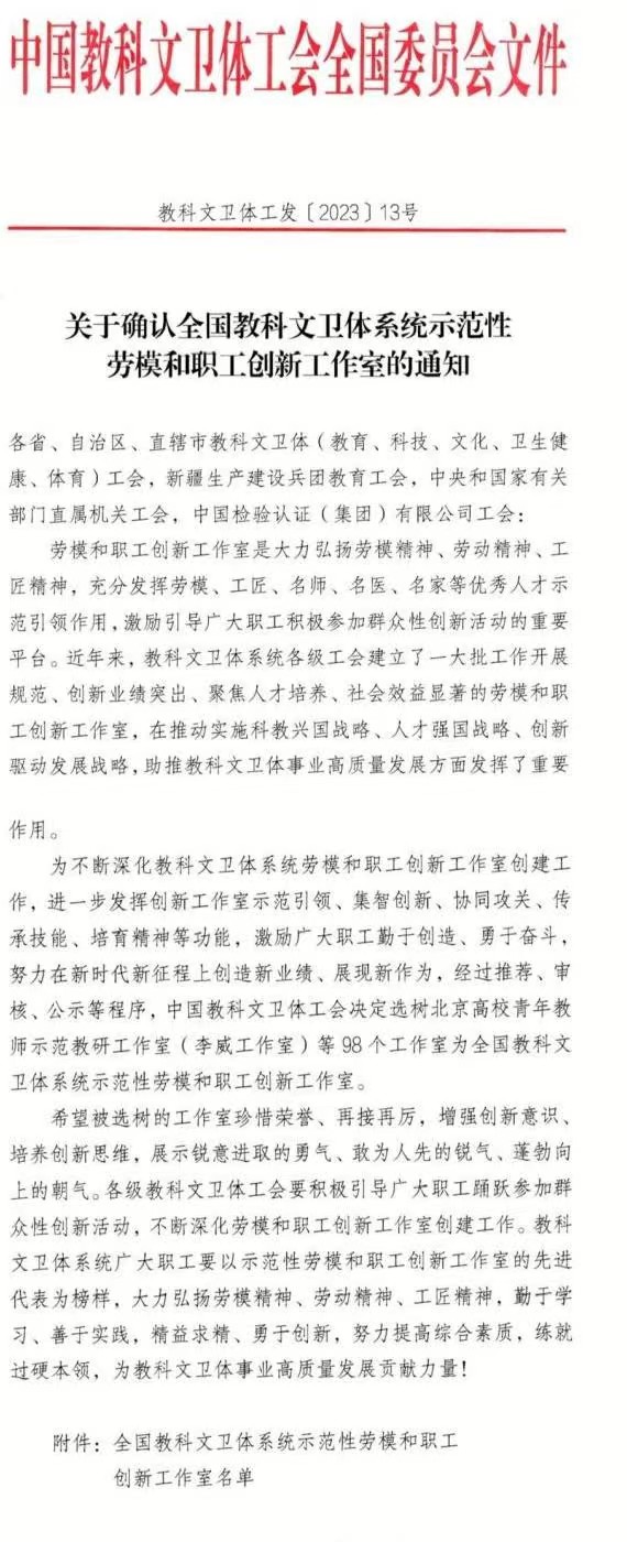 近日,中国教科文卫体工会委员会发布了《关于确认全国教科文卫体系统示范性劳模和职工创新工作室的通知》,选树98个工作室为全国教科文卫体系统示范性劳模和职工创新工作室,356官网寇子明劳模创新工作室成功入选。