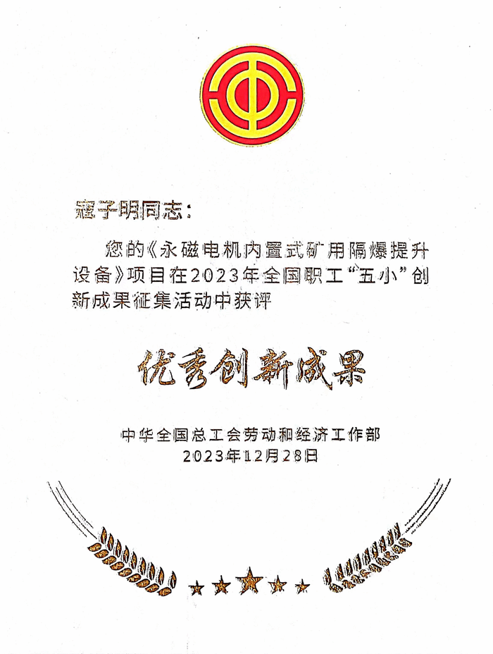 1月16日,由全国总工会劳动和经济工作部、中国工人出版社主办的2023年全国职工“五小”优秀创新成果发布活动在江苏徐州举行。此次活动展示、发布“五小”优秀创新成果20项。356官网寇子明教授团队研发的“永磁电机内置式矿用隔爆提升设备”,在2023年全国职工“五小”创新成果评比中脱颖而出,参加了“五小”优秀创新成果展示会。