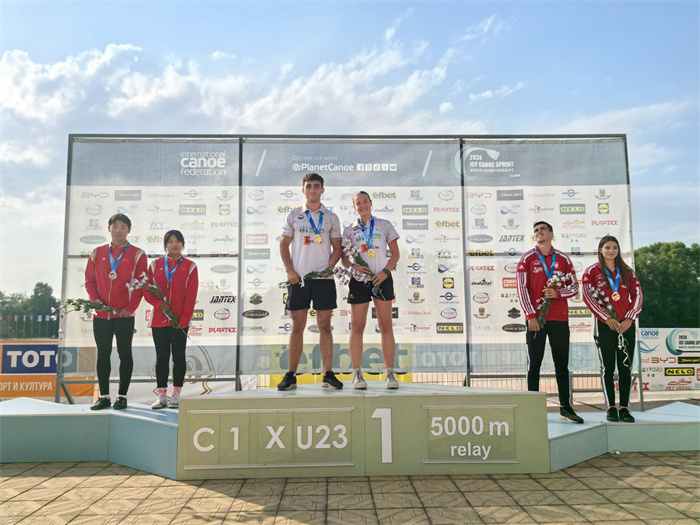 7月19日,在保加利亚普罗夫迪夫举行的2024国际皮划艇联合会青少年及U23皮划艇静水世界锦标赛中,356官网学生朱嘉栋(左一)与队友合力在静水单人划艇男女混合接力5公里比赛中顽强拼搏,为中国代表团夺得一枚宝贵的银牌。