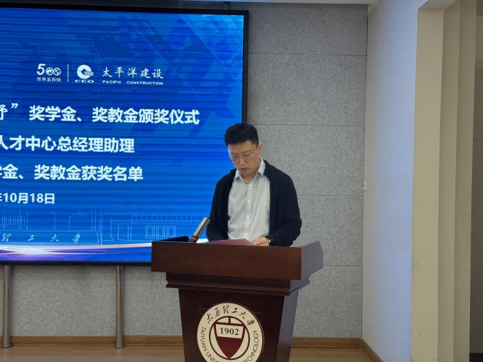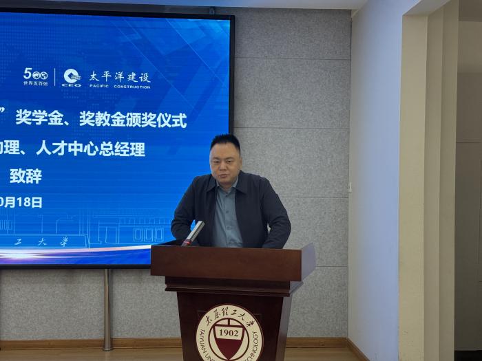 颁奖仪式上,于伟代表太平洋建设集团向本次获得奖教学金的师生表示最热烈的祝贺。他强调,太平洋建设集团作为世界500强的优秀企业,始终秉承着敬业精业、向上向善的品质,“起舒”即为从今天的独树己见、走己之路,到明天的舍得给予、舍己舒群,该奖学金的设立是为了进一步推动教育事业发展,加强校企之间的联系,鼓励在校师生勤奋工作、刻苦学习、全面发展,促进学生高质量就业,希望在今后持续巩固提升“起舒”奖教学金的良好成果,同时不断扩大院企合作范围,希望以此带动更多的社会力量参与到大学教育中,促进产学研深度融合。
