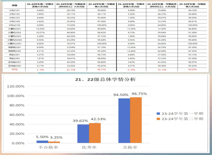 根据学情数据统计,2023-2024学年中,21级和22级学生的不及格率从第一学期的5.50%下降至第二学期的3.25%,降幅达2.25%。与此同时,优秀率从第一学期的39.62%提升至第二学期的42.53%,增长了2.91%。这些数据的积极变化不仅体现了学生整体成绩的显著提升,也充分证明了学院在学风建设方面取得的成效。