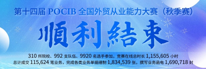 据悉:POCIB全国外贸从业能力大赛由中国国际贸易学会主办,是目前国际经济贸易专业领域参赛人数较多、展示我国外经贸教育成果和相关专业学生专业水平的顶级赛事。竞赛分为POCIB国际贸易从业技能综合实训模块和数字贸易B2B模块两项内容。POCIB国际贸易从业技能综合实训模块的考核内容包括国际贸易买卖合同的磋商过程,询盘、发盘、还盘和接受环节的英文函电写作技巧;主要贸易术语和结算方式的细节和运用;进出口商品的价格核算、成本控制和扩大利润的方法;国际贸易买卖合同的商定;进出口业务履约基本技巧;主要进出口单据的缮制与运用等。数字贸易B2B模块的考核内容包括在数字贸易B2B电商平台中进行店铺入驻、商品发布、交易磋商、起草订单、订单履约和营销活动等跨境电商外贸环节中的各项业务流程操作。本届比赛吸引了全国310所院校、992支队伍、9920名选手参加,竞赛在线总时长1155605小时,总计成交115624笔业务,完成各类业务单据1834539张,撰写业务函电1690718封。