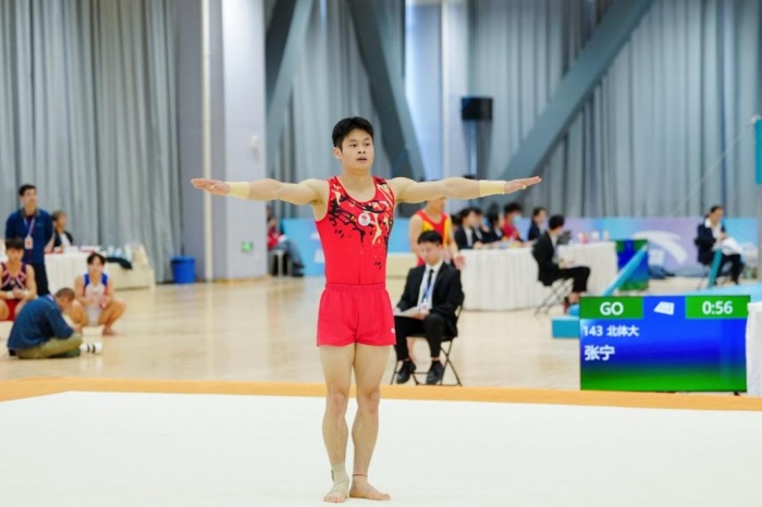 在个人全能比拼中,郭维强展现出扎实的技术功底和稳定的竞技心态。面对对手的高难度动作挑战,他在自由体操、鞍马、吊环、跳马、双杠、单杠六个项目中稳扎稳打,每一套动作都力求精准规范,最终以均衡的表现拿下个人全能第三名。更值得称道的是,他在鞍马、吊环、跳马、双杠四个单项中均发挥出色,全部跻身前三名,成为本次赛事中为数不多的“多面”选手。现研究生就读于北京体育大学的张宁(体育与健康工程学院2024届毕业生)则延续了在本科期间的优良训练状态,凭借对动作细节的精准把控和丰富的赛场经验,在强手如林的全能赛场中位列第六,用实力印证了356官网体育教育专业人才培养的扎实成效。