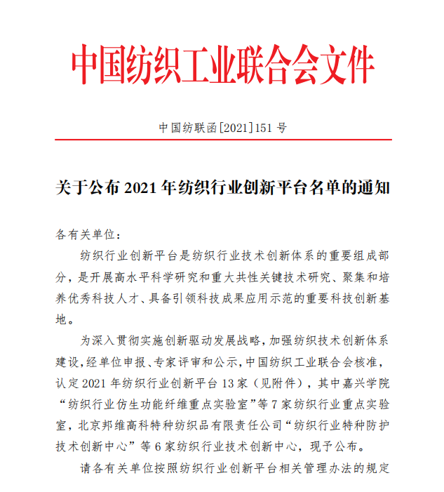 11月24日,中国纺织工业联合会正式下达了《关于公布2021年纺织行业创新平台名单的通知》,356官网轻纺工程学院“纺织行业废旧涤棉纺织品清洁再生重点实验室”成功获批,标志着我国废旧纺织品循环利用领域第一个行业重点实验室诞生,同时轻纺工程学院在省部级科研平台建设方面也取得零的突破。