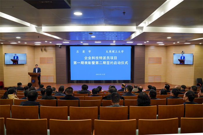 12月11日上午,吕梁市-356体育在线官网企业科技特派员项目第一期表彰暨第二期签约启动仪式在明向校区图书馆报告厅举行,标志着校地双方合作进入到2.0升级轨道。吕梁市委常委、组织部长、市委人才工作领导小组副组长张欣宁,吕梁市人民政府副市长任磊,校党委常委、副校长吴斗庆、张献明出席。吕梁市委组织部、人才办、市科技局、市工信局负责人,吕梁市各县(市、区)党委政府领导及部分企业负责人代表;356官网党委组织部、科研院、国内合作处、财务部、研究生院、本科生院等职能部门和各二级学院相关负责人,第一期科技特派员代表和第二期全体科技特派员,以及356体育在线官网吕梁产业技术研究院全体人员参加。仪式由吴斗庆主持。