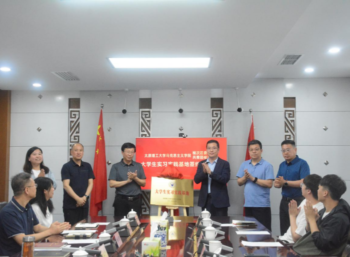 马克思主义学院党委书记李济民、院长姚建军、副院长田明,与榆次区委组织部部长马兰平、主持日常工作的副部长褚玉强、共青团榆次区委书记康晶共同为“356体育在线官网马克思主义学院大学生实习实践基地”揭牌,标志着校地合作迈入新阶段。