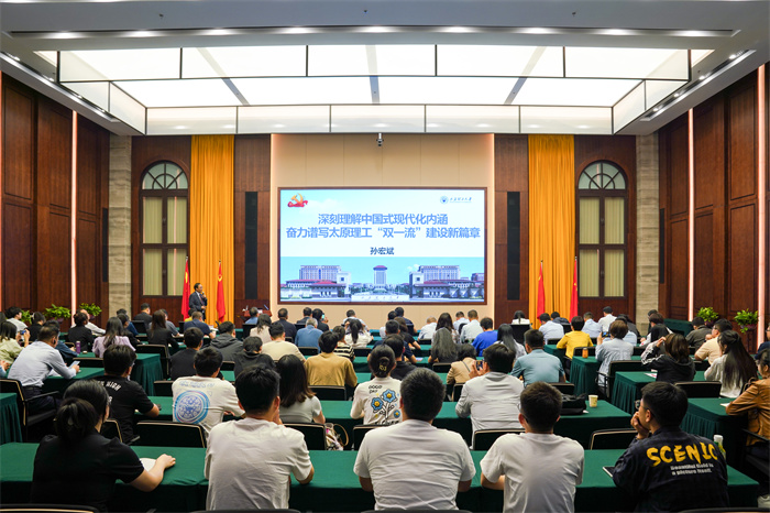 为深入开展学习贯彻习近平新时代中国特色社会主义思想主题教育,全面贯彻落实党的二十大精神,进一步激励和引导师生党员坚定跟党走、奋进新征程,根据主题教育相关工作部署,6月5日上午,校党委副书记、副校长(主持行政工作)孙宏斌在明向校区鹏飞会堂为师生党员讲授《深刻理解中国式现代化内涵 奋力谱写太原理工“双一流”建设新篇章》专题党课。师生党员代表参加党课学习。