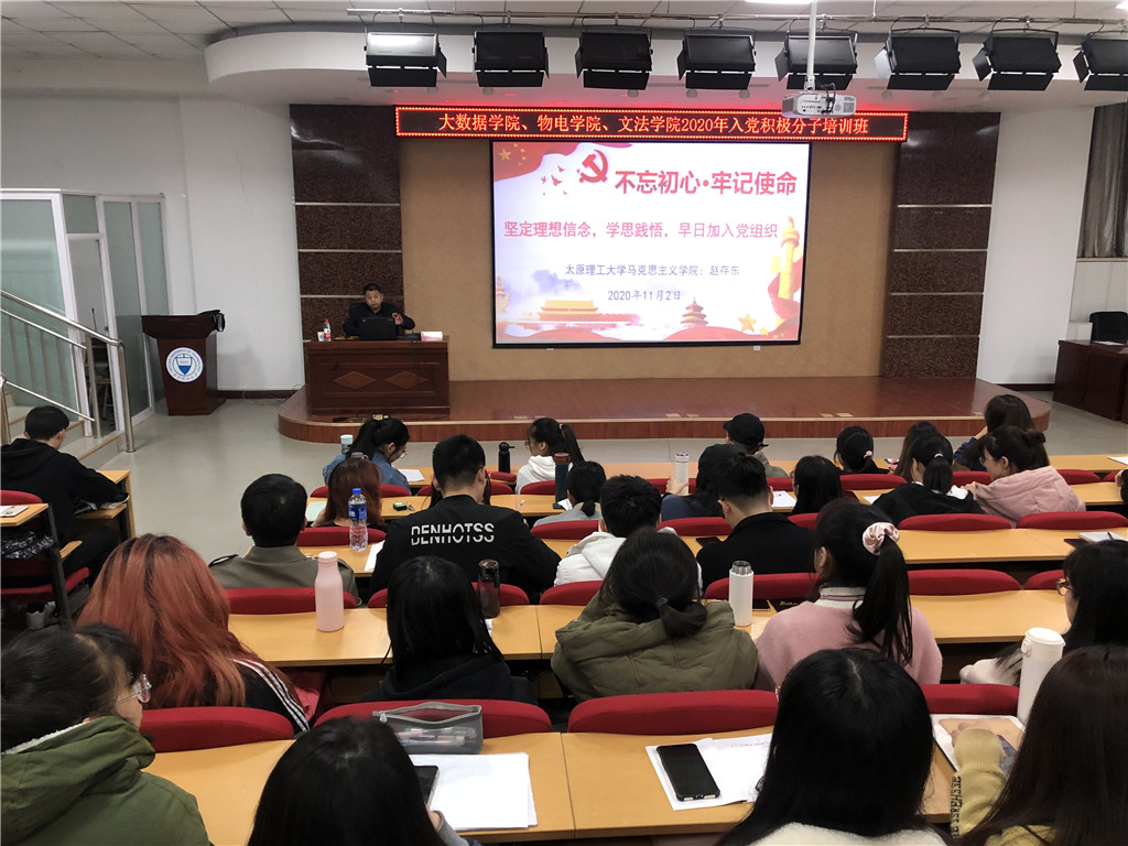 11月2日至9日,大数据学院、物理与光电工程学院、文法学院在明向校区外国语学院一层报告厅共同举办2020年入党积极分子培训班,特邀请马克思主义学院党委副书记赵存东以及胡文秀、樊荣、李银香、霍剑昶等五位老师开展理论授课。来自大数据学院、物电学院、文法学院320名入党积极分子参加本次培训。