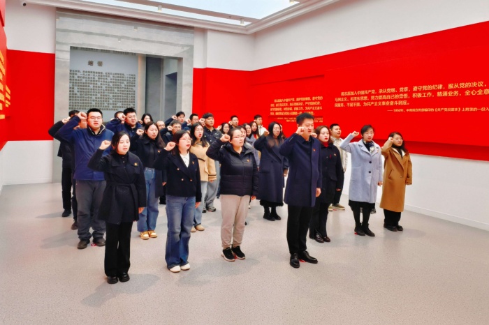在宣誓厅,全体同志高举右拳,面对党旗庄严宣誓。在铿锵有力的誓词声中叩问入党初心,许下坚定承诺。