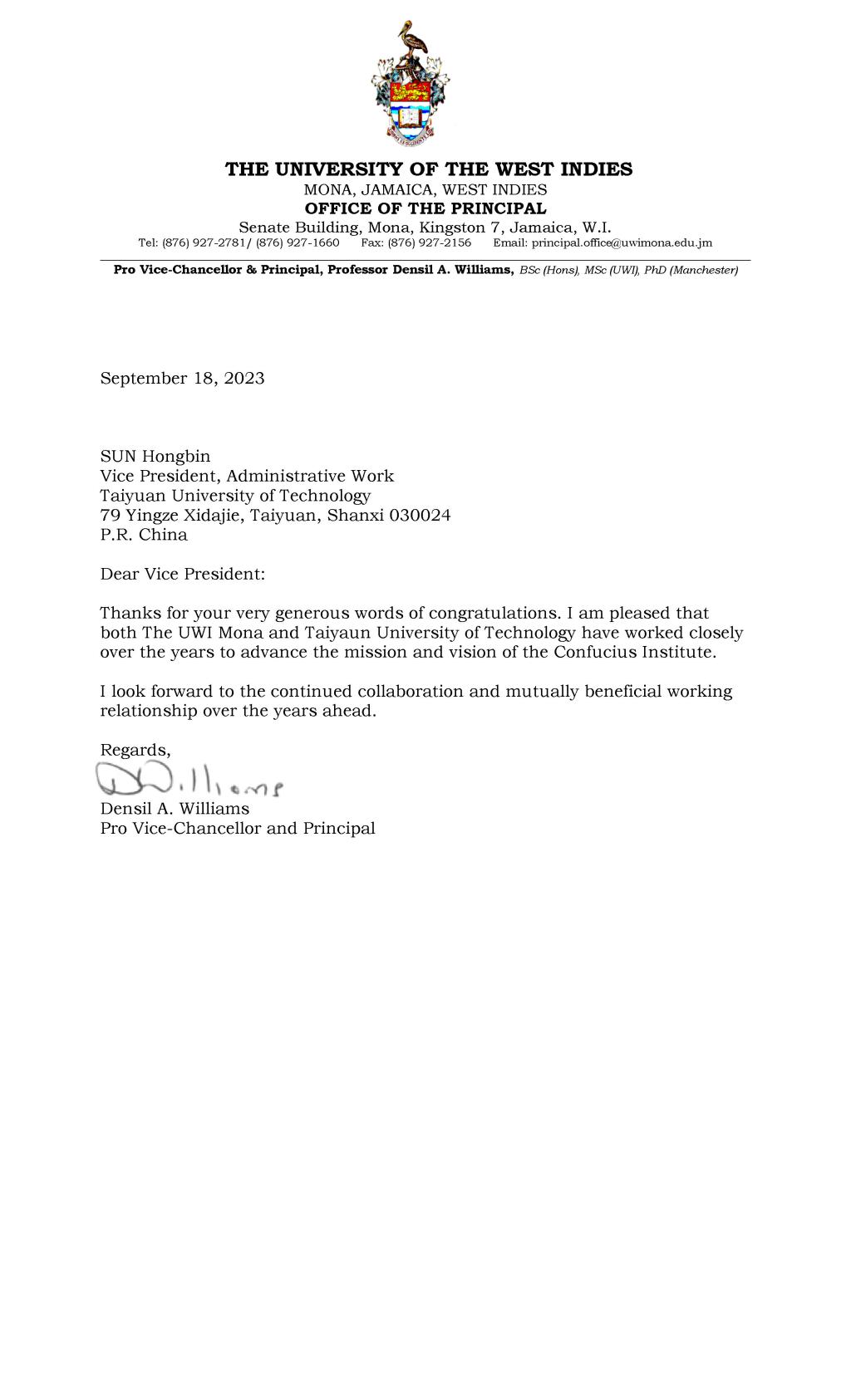 丹希尔·威廉姆斯校长复函表示感谢并希望双方可以继续深化合作,为孔子学院发展作出积极贡献。