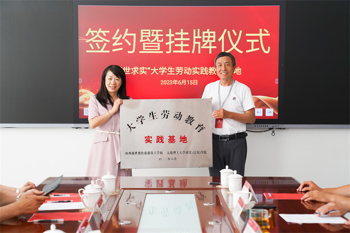6月15日,求实(宗复)学院在山西盛世餐饮旅游技工学校与该校签署共建协议,并举行“盛世求实”大学生劳动教育实践基地挂牌仪式。求实学院党总支书记张文基,本科生院副院长、求实学院院长宋燕、副院长张培智等学院领导和教师代表,山西盛世餐饮旅游技工学校校长王建军、常务校长王安邦、副校长余卫明、山西面食科技研究院常务院长刘志娟以及相关部门负责人等一起出席此次挂牌仪式。