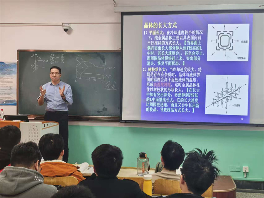 课堂教学中,占小红以“金属成形工艺与国家重大战略需求”为主线,结合自身在该领域丰富的科研经历与典型案例,生动阐述了金属成形工艺在高新武器装备、航空航天等国防军工与重大科技领域中的核心地位与关键作用。他将前沿科研成果融入基础理论教学,将知识传授与价值引领有机结合,课堂内容翔实、深入浅出、引人入胜。为启发学生思考,他在授课过程中设置了互动提问环节。他结合课程内容,就“如何理解枝晶生长与温度梯度之间的关系”等问题向同学们发问,引导大家深入剖析现象背后的科学原理。同学们踊跃回答,各抒己见,他则耐心倾听,并适时给予点评与延伸讲解。在一问一答中,不仅活跃了课堂气氛,更深化了同学们对重点、难点知识的理解。